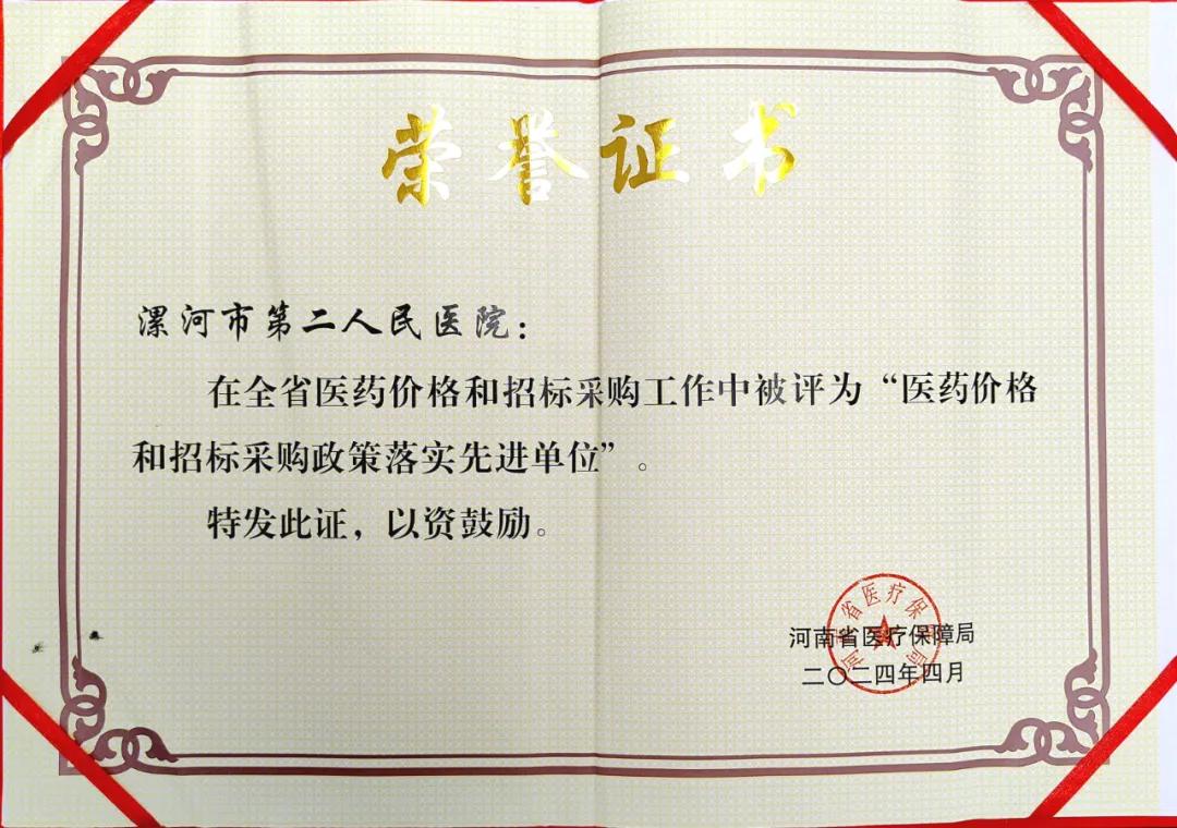 近日,市二院在全省醫(yī)藥價(jià)格和招標(biāo)采購工作綜合評價(jià)中,被河南省醫(yī)療保障局評為“醫(yī)藥價(jià)格和招標(biāo)采購政策落實(shí)先進(jìn)單位”。