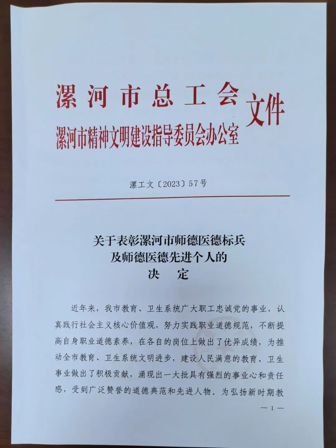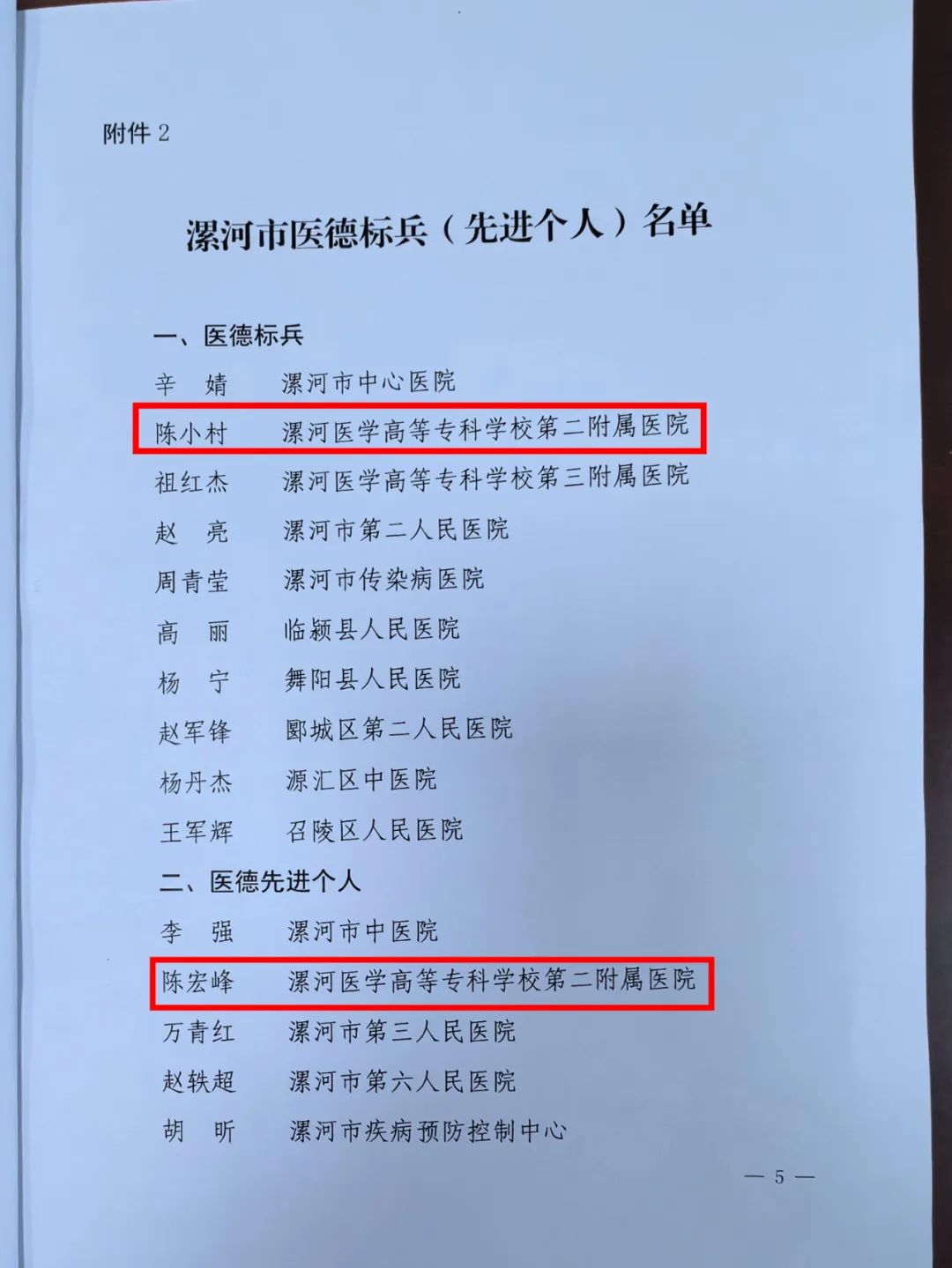 為推動(dòng)全市教育、衛(wèi)生系統(tǒng)文明進(jìn)步,建設(shè)人民滿意的教育、衛(wèi)生事業(yè),進(jìn)一步激勵(lì)教育、衛(wèi)生系統(tǒng)廣大職工不斷開(kāi)創(chuàng)中國(guó)式現(xiàn)代化建設(shè)漯河實(shí)踐新局面努力奮斗,近日,漯河市總工會(huì)、漯河市精神文明建設(shè)指導(dǎo)委員會(huì)辦公室聯(lián)合發(fā)布了《關(guān)于表彰漯河市師德醫(yī)德標(biāo)兵及師德醫(yī)德先進(jìn)個(gè)人的決定》,漯河市骨科醫(yī)院(漯河醫(yī)專二附院、漯河市立醫(yī)院)耳鼻咽喉科主任陳小村獲得“漯河市醫(yī)德標(biāo)兵”榮譽(yù)稱號(hào),足踝外科主任陳宏峰獲得“漯河市醫(yī)德先進(jìn)個(gè)人”榮譽(yù)稱號(hào)。