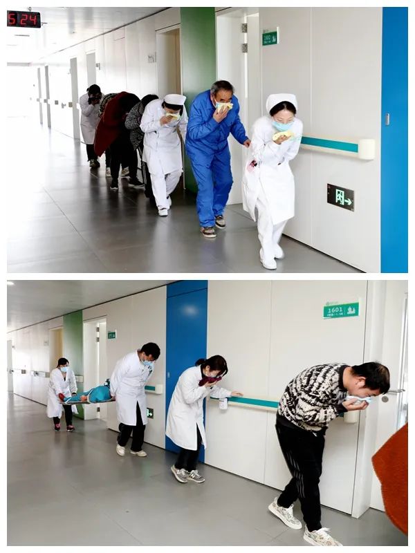 按照預案流程,醫(yī)院各救援小組緊急開展救援,科室醫(yī)護人員立即組織引導患者和家屬有序進行疏散撤離。對于不能行動的病人,醫(yī)護人員通過擔架迅速將其轉移至安全地帶。