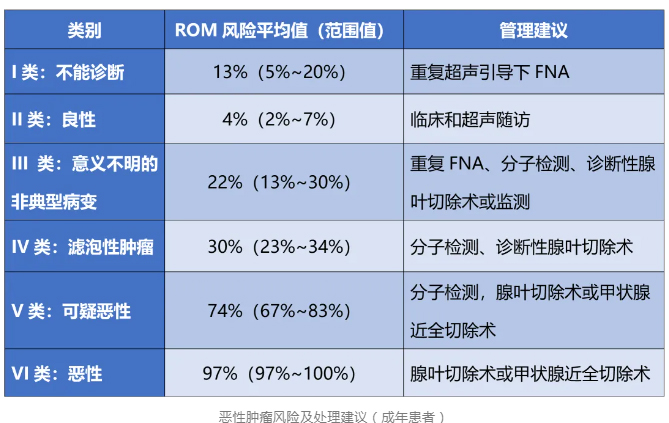 Ⅵ級:惡性腫瘤,細(xì)胞學(xué)特點(diǎn)是標(biāo)本細(xì)胞形態(tài)無可爭議為惡性。惡性腫瘤包括乳頭狀癌(PTC)、濾泡癌、髓樣癌等,臨床建議甲狀腺全切或腺葉切除。