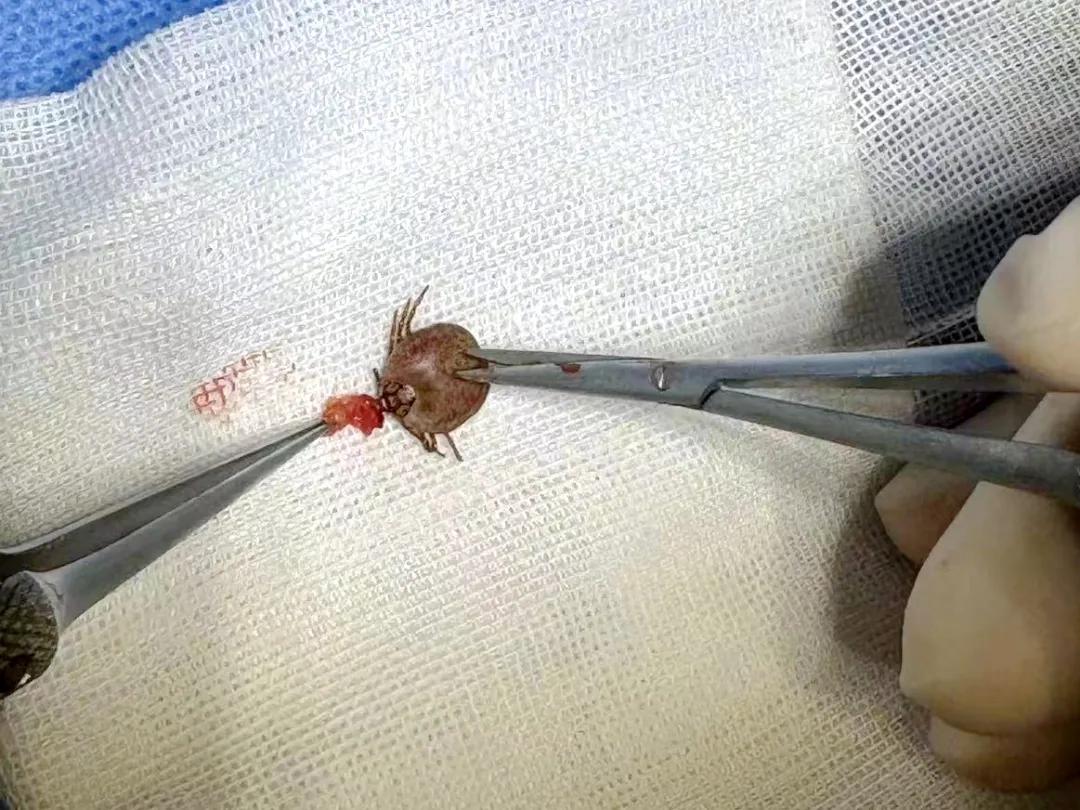 44歲的馬女士,3天前曾在南陽山地茶園采摘春茶,不知不覺中被蜱蟲咬傷右側(cè)大腿內(nèi)側(cè),因局部疼痛,同行人員幫忙查看發(fā)現(xiàn)有一個黑色的“小圓粒”,以為是皮膚上長了疣,后來發(fā)現(xiàn)異物長有多條腿,并且會蠕動。因此種情況不是十分常見,馬女士回家后輾轉(zhuǎn)多家醫(yī)院診治均無法取出。