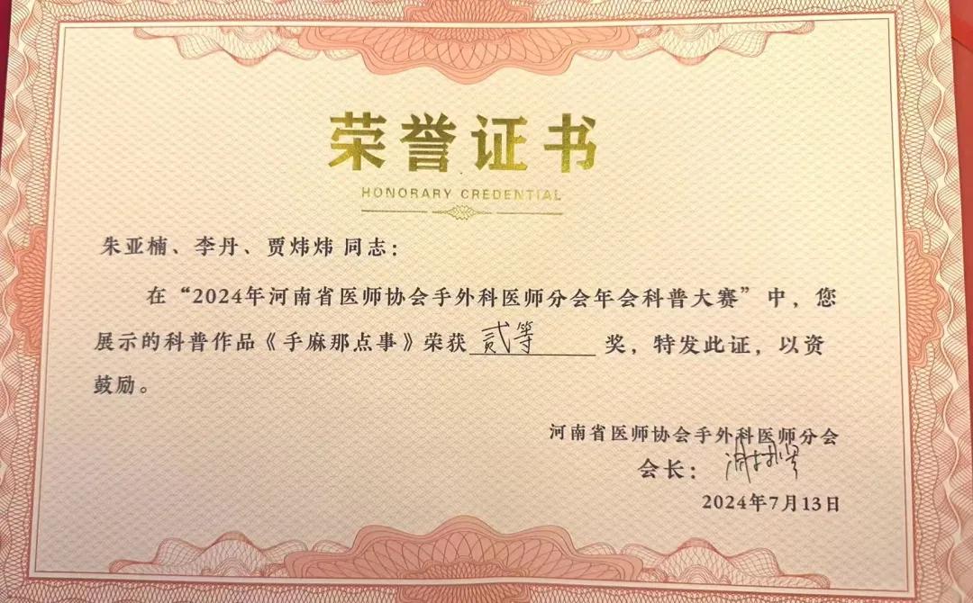 下午,在“2024年河南省醫(yī)師協(xié)會手外科醫(yī)師分會年會科普大賽”上,來自全省各地的精英選手們以生動多樣的形式,將復(fù)雜的醫(yī)學(xué)知識轉(zhuǎn)化為易于理解、貼近生活的科普內(nèi)容,展現(xiàn)了手外科醫(yī)學(xué)的魅力與溫度。經(jīng)過激烈角逐,漯河市骨科醫(yī)院(漯河醫(yī)專二附院、漯河市立醫(yī)院)副主任醫(yī)師代彭威、護師李丹、護士賈煒煒榮獲二等獎。他們在工作之余,以《腕管綜合征》為題積極準(zhǔn)備,認真撰寫演講材料、精心制作演講幻燈片、反復(fù)推敲演練,對腕管的高發(fā)人群以及怎么預(yù)防怎么鍛煉,進行了生動形象的專題講解。在高手云集的大賽中榮獲優(yōu)異成績,充分展示了漯河市骨科醫(yī)院手外科團隊在學(xué)術(shù)研究與科普傳播方面的雙重實力。