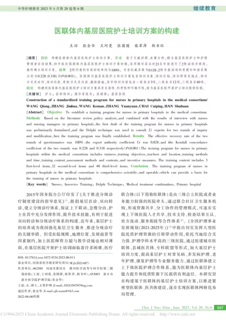 漯河醫(yī)專二附院(漯河市骨科醫(yī)院、漯河市立醫(yī)院)作為國家三級綜合醫(yī)院,高度重視醫(yī)聯(lián)體建設(shè),自2019年成立醫(yī)聯(lián)體組織以來,作為牽頭單位已簽署了30余家成員單位,近年來不斷探索基層醫(yī)院護士來院培訓(xùn)學(xué)習(xí)方案,2021年我院申報獲批河南省醫(yī)學(xué)教育研究項目1項,項目名稱為“區(qū)域醫(yī)療聯(lián)合體內(nèi)基層醫(yī)院護士規(guī)范化培訓(xùn)管理模式的構(gòu)建”,項目團隊成員經(jīng)過文獻檢索、調(diào)查研究、專家函詢等形式構(gòu)建了“基于醫(yī)聯(lián)體的基層醫(yī)院護士培訓(xùn)方案”,該培訓(xùn)方案具有可信性、可行性和可操作性,內(nèi)容全面,有助于提高基層護士專業(yè)服務(wù)能力的提升,被中文核心期刊中華護理教育雜志錄用并發(fā)表。