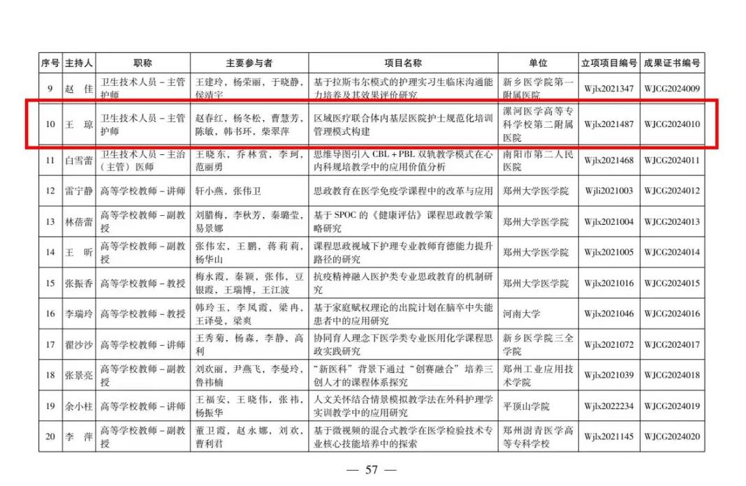 近日,河南省衛(wèi)生健康委員會下發(fā)了《關(guān)于公布2024年河南省醫(yī)學(xué)教育研究項目立項教學(xué)成果和優(yōu)質(zhì)課評選結(jié)果的通知》,由漯河市骨科醫(yī)院(漯河醫(yī)專二附院、漯河市立醫(yī)院)王瓊、趙春紅、楊冬松、曹慧芳、陳敏、韓書環(huán)、柴翠萍團隊完成的《區(qū)域醫(yī)療聯(lián)合體內(nèi)基層醫(yī)院護士規(guī)范化培訓(xùn)管理模式構(gòu)建》項目完成結(jié)項,被授予2024年河南省醫(yī)學(xué)教育優(yōu)秀教學(xué)成果一等獎。