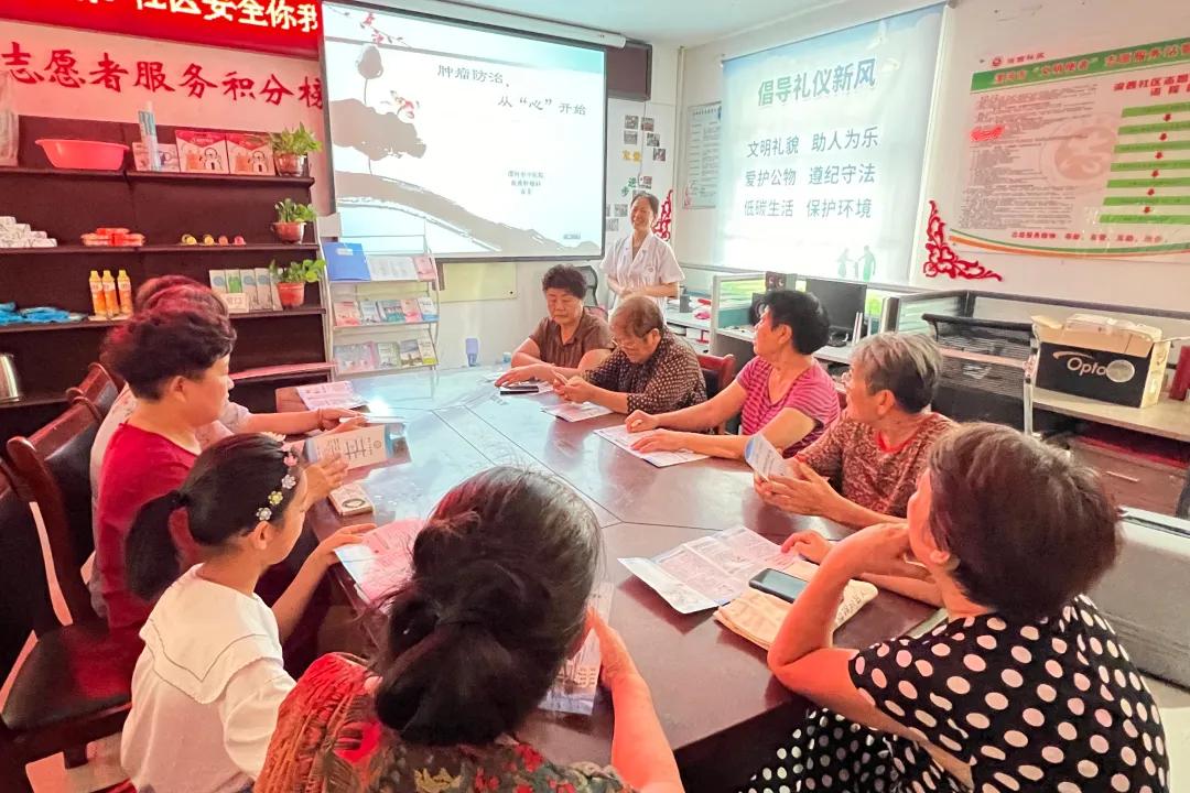 腫瘤科護士長袁菲為社區(qū)居民講授腫瘤防治相關(guān)科普知識,并從學(xué)會正確接受自己的情緒,學(xué)會自我調(diào)節(jié)。轉(zhuǎn)移生活重心,找到支持,找到心靈寄托以及健康合理的運動,保持睡眠充足等方面來詳細展開講解。指出保持良好的積極樂觀心態(tài),做到心理平衡,這都有利于預(yù)防癌癥。