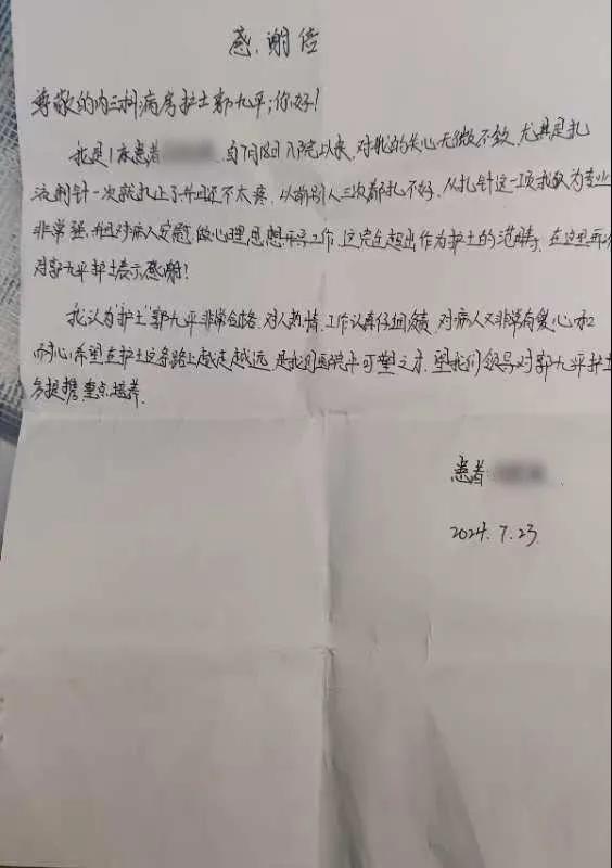 病情穩(wěn)定后,患者及家屬特意送來(lái)感謝信,向心內(nèi)一科的全體醫(yī)務(wù)人員表達(dá)感謝。漯河市骨科醫(yī)院(漯河醫(yī)專二附院、漯河市立醫(yī)院)心血管內(nèi)科一病區(qū)(內(nèi)三科)始終以病人為中心,以專業(yè)的技術(shù)和細(xì)致入微的關(guān)懷提供優(yōu)質(zhì)醫(yī)療服務(wù),全力以赴為病人的健康保駕護(hù)航!(盧 闖 劉 旭 袁錦鈺)