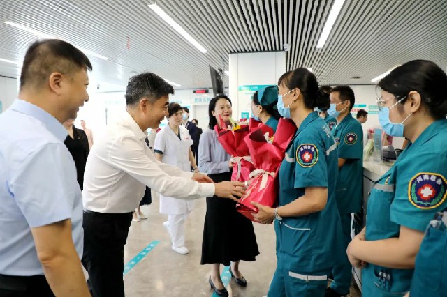 在急診科,宋耀生書記、于宏副主任向急救人員送上鮮花,對他們在急救救援和保障人民生命健康方面所做出的貢獻(xiàn)表示肯定。“急診科是衛(wèi)健系統(tǒng)和醫(yī)院的前沿陣地,你們時(shí)刻待命,聞令出擊,為患者救治爭分奪秒,大家辛苦了!”領(lǐng)導(dǎo)的話語溫暖著每一位急診醫(yī)師的心。