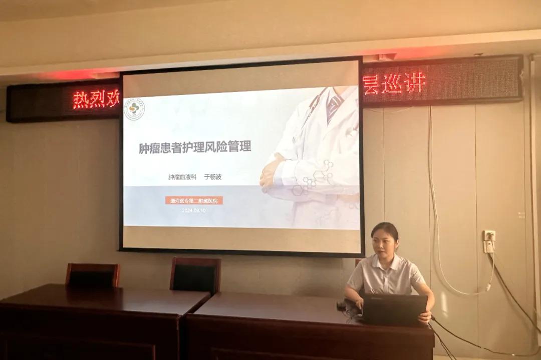 此次巡講中,于楊波護士長、張姣主管護師、王惠娟主管護師分別就《腫瘤患者護理風險管理》《靜脈治療血管通路管理規(guī)范》《腫瘤患者癌痛規(guī)范化管理》為主題進行了精彩分享。其中于楊波護士長主要是從腫瘤患者常見的護理風險問題如何識別、評估、規(guī)范管理以及護理風險管理的一些措施、經(jīng)驗、理念進行了分享。