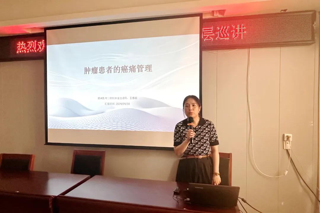 王惠娟主管護師以《腫瘤患者癌痛規(guī)范化管理》為主題,分享了腫瘤患者癌痛的規(guī)范化管理、評估,藥物的三階梯,常見的止疼藥應用過程中的誤區(qū)以及中醫(yī)護理適宜技術(shù)在癌痛中的應用等內(nèi)容。