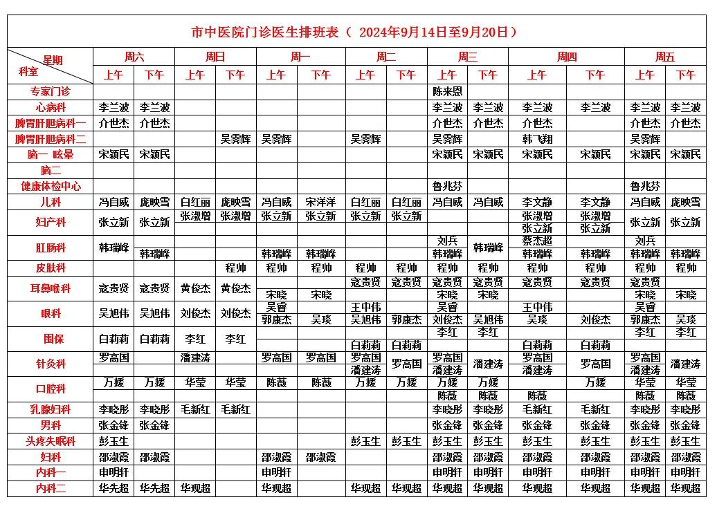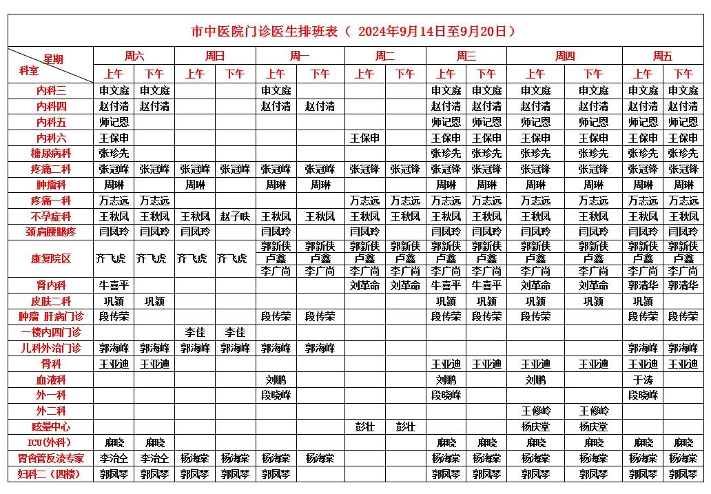 漯河市中醫(yī)院門(mén)診醫(yī)生排班表