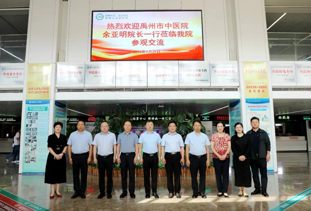 金風(fēng)送爽,攜手同行。9月29日上午,禹州市中醫(yī)院院長余亞明、業(yè)務(wù)院長耿建領(lǐng)、副院長夏瓊玉、醫(yī)務(wù)科科長李帥奇一行蒞臨市二院參觀交流。市二院黨委書記魏松,紀(jì)委書記孟德陽,副院長張曉東、李世學(xué)、劉橋及相關(guān)職能科室負(fù)責(zé)同志陪同交流。