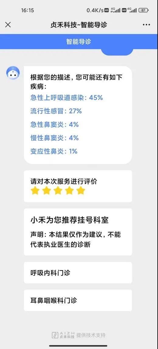 智能導(dǎo)診系統(tǒng)是通過(guò)多輪人機(jī)對(duì)話,根據(jù)患者對(duì)癥狀的描述了解患者病情,判斷患者所患疾病概率,自動(dòng)為患者推薦最合適的掛號(hào)科室,并展示相應(yīng)的醫(yī)療信息,解決患者盲目就醫(yī)問(wèn)題,有效提升患者就醫(yī)體驗(yàn),緩解醫(yī)院導(dǎo)診咨詢(xún)壓力,推動(dòng)精準(zhǔn)就醫(yī)服務(wù)。
