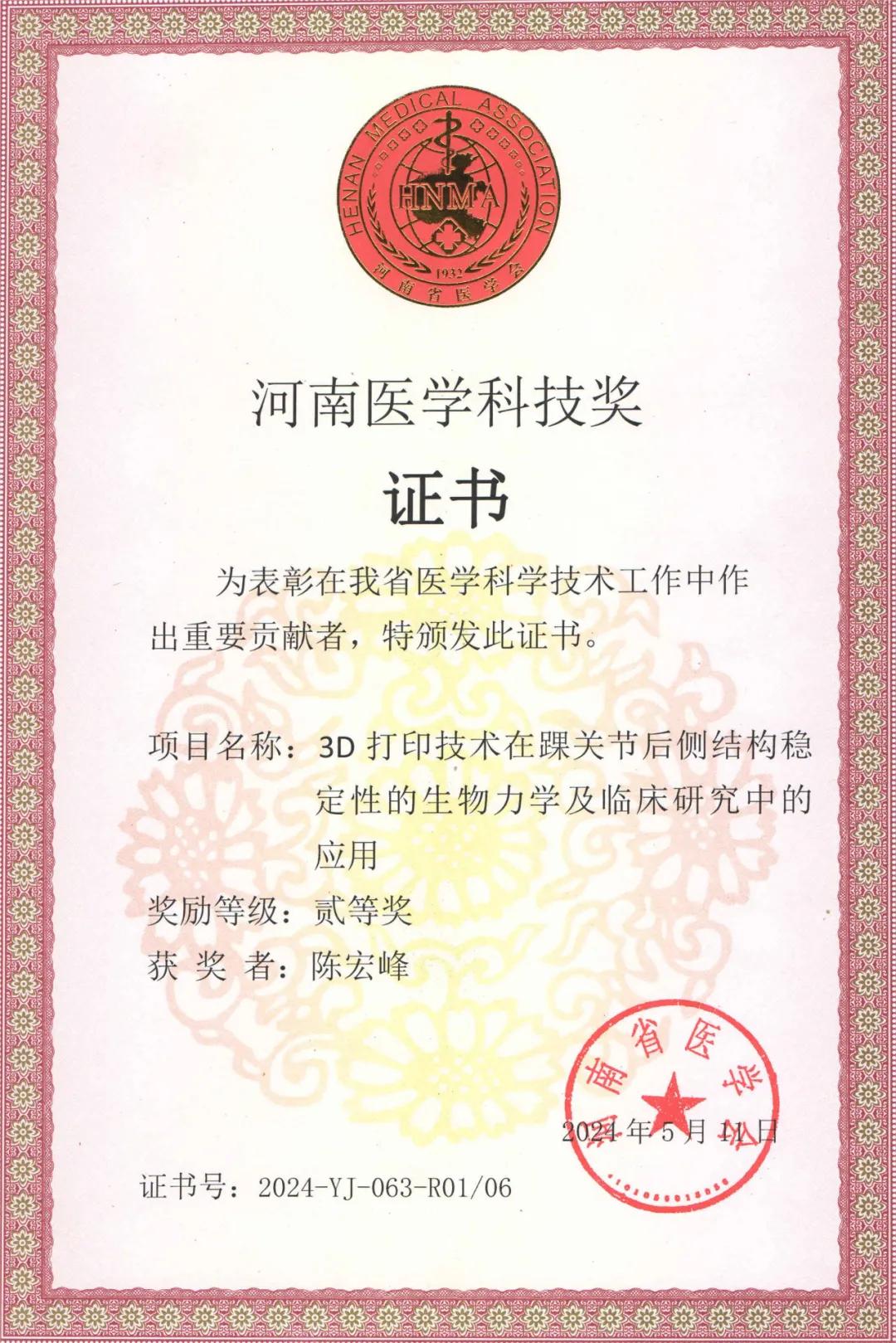 在陳宏峰主任帶領下,2012年起,在豫中南地區(qū)率先開展踇外翻、平足癥、高弓足畸形的規(guī)范化矯治。2012年完成豫中南第一例自體韌帶重建治療踝關(guān)節(jié)外側(cè)韌帶陳舊性損傷,2019年完成豫中南第一例踝上截骨術(shù)(SMO)治療踝關(guān)節(jié)骨性關(guān)節(jié)炎,2020年完成豫中南第一例軟骨移植術(shù)(AOT)治療距骨軟骨損傷。2021年完成豫中南第一例人工全踝關(guān)節(jié)置換術(shù)治療終末期踝關(guān)節(jié)骨性關(guān)節(jié)炎,2024年開展人工跖趾關(guān)節(jié)置換治療踇外翻、類風濕關(guān)節(jié)炎足,相繼開展了脛骨橫向骨搬運術(shù)治療糖尿病足,應用骨科手術(shù)機器人結(jié)合髓內(nèi)釘微創(chuàng)治療踝關(guān)節(jié)骨折、跟骨骨折,踝關(guān)節(jié)鏡下微創(chuàng)修復踝關(guān)節(jié)外側(cè)韌帶損傷等領先技術(shù),在豫中南地區(qū)享有盛譽。