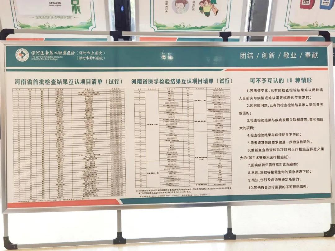 在門診大廳、檢驗大廳、簡易門診等就診區(qū)域和位點擺放了“河南省首批檢查結果互認項目清單”“河南省醫(yī)學檢驗結果互認項目清單”等詳細內容,持續(xù)加強宣教和講解,切實把好事辦好、實事辦實。