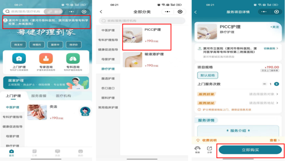 2.進入后查看醫(yī)院是否正確,以下內容以PICC護理為例:選擇PICC護理,點擊立即購買。