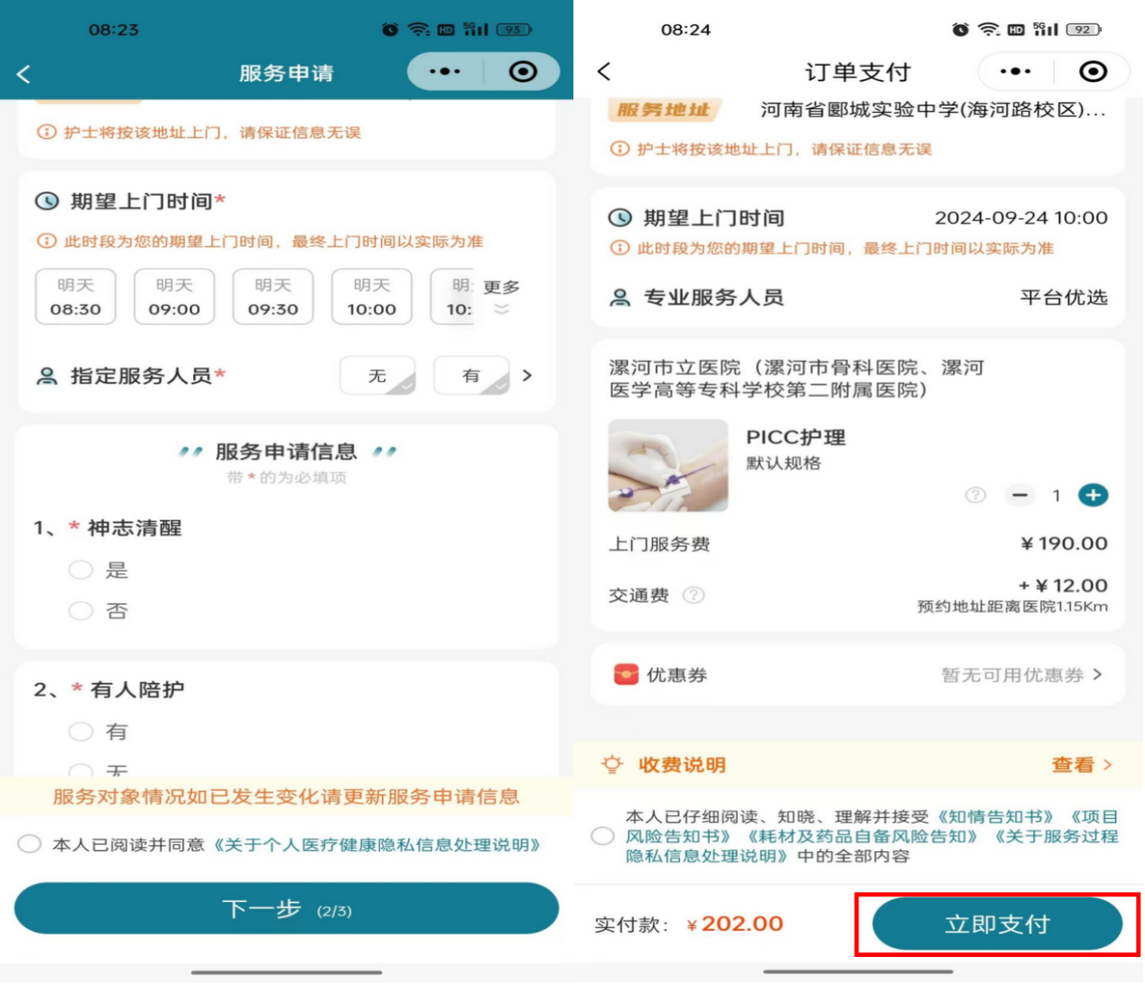 4.各項信息填寫后,支付訂單,護士接單后會與下單人電話聯(lián)系再次確認。