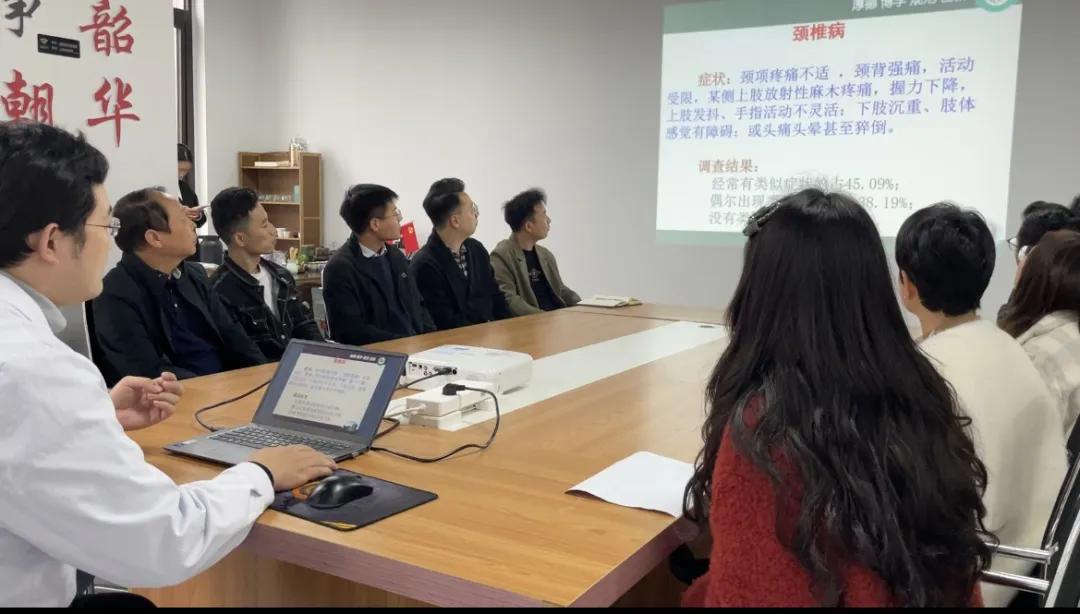 在同步進行的健康科普進企業(yè)現場,市二院中醫(yī)針灸科副主任趙劍鋒針對電商從業(yè)者長期久坐的職業(yè)特點,重點講解了頸椎病、腰椎病等疾病的預防和應對方法,并從日常飲食、科學的鍛煉方法、緩解疲勞的小妙招、心理壓力的釋放途徑與參會人員進行了分享。參會職工們跟隨講解邊聽邊學,現場氣氛熱烈,活動效果超出預期。