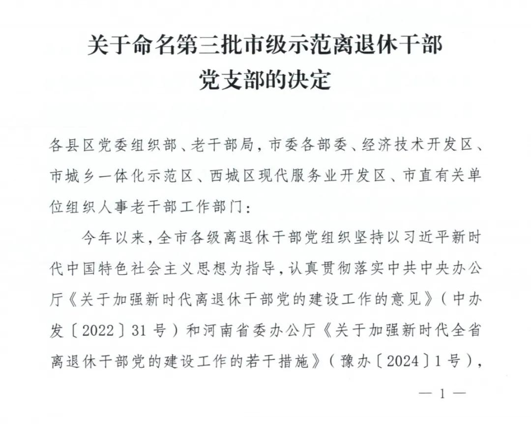 近日,市委組織部、市委老干部局印發(fā)了《關(guān)于命名第三批市級(jí)示范離退休干部黨支部的決定》(漯老〔2024〕32號(hào)),市二院離退休第一黨支部被評(píng)為第三批市級(jí)示范離退休干部黨支部,同時(shí)也是漯河市衛(wèi)生健康系統(tǒng)唯一受到表彰命名的單位。