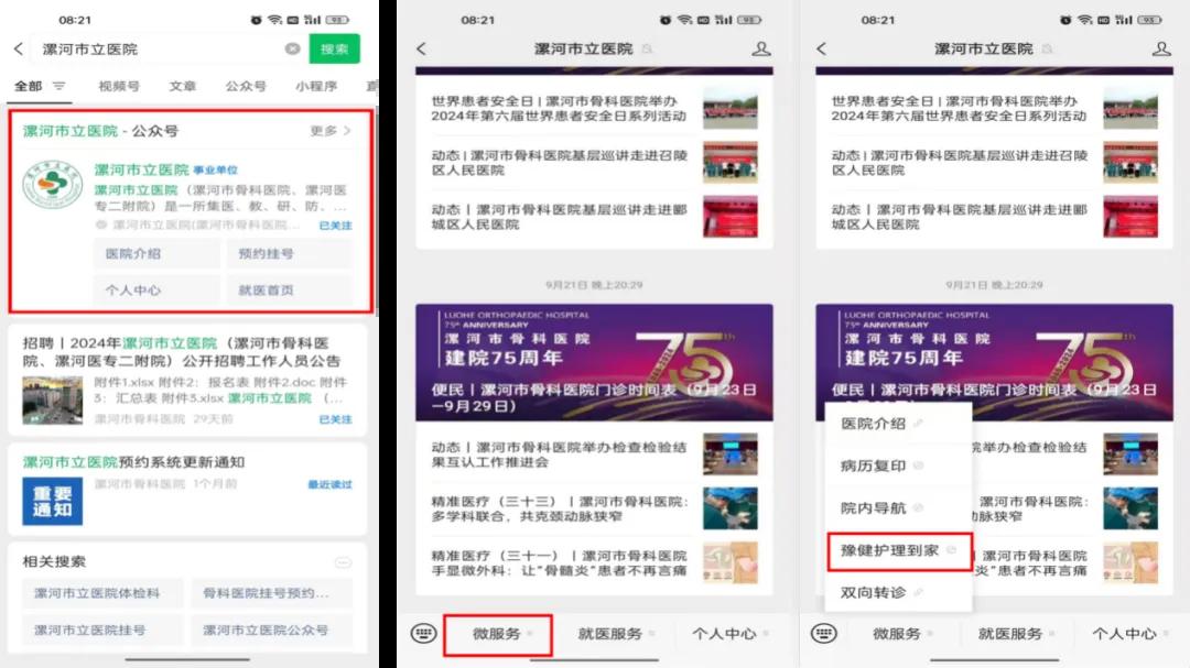 1.微信公眾號(hào)搜索“漯河市立醫(yī)院”,進(jìn)入公眾號(hào)點(diǎn)擊“微服務(wù)”,選擇“豫健護(hù)理到家”。