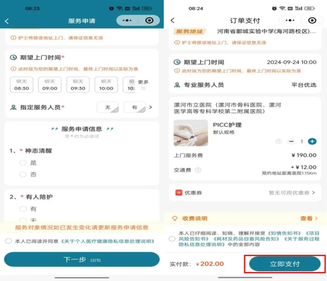 4.各項(xiàng)信息填寫(xiě)后,支付訂單,護(hù)士接單后會(huì)與下單人電話(huà)聯(lián)系再次確認(rèn)。