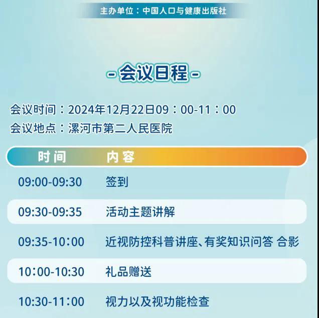 12月22日上午9:00(本周日),追光行動(dòng)-兒童青少年近視防控科普講座將在漯河市第二人民醫(yī)院眼科門診舉辦,屆時(shí)將有眼科專家為青少年兒童及家長奉上一場精彩的科普講座,進(jìn)行免費(fèi)現(xiàn)場咨詢指導(dǎo)。誠摯邀請感興趣的兒童及家長朋友們前來參與活動(dòng)。