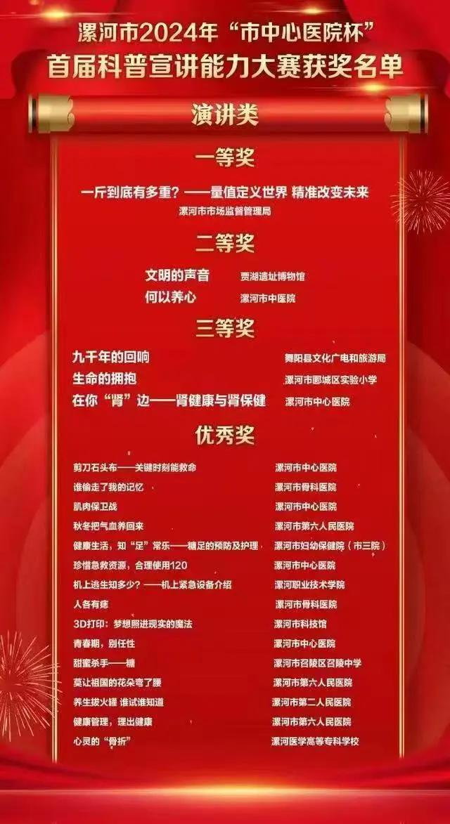本次大賽由中共漯河市委宣傳部、中共漯河市委人才工作領(lǐng)導(dǎo)小組辦公室、漯河市科學(xué)技術(shù)協(xié)會(huì)、漯河市衛(wèi)生健康委員會(huì)聯(lián)合主辦。市中醫(yī)院積極響應(yīng)“普及科學(xué)知識(shí),弘揚(yáng)科學(xué)精神”的大賽主旨,送演內(nèi)容豐富,形式多樣的作品,助力健康科普理念的傳播,并取得了優(yōu)異的成績(jī)。