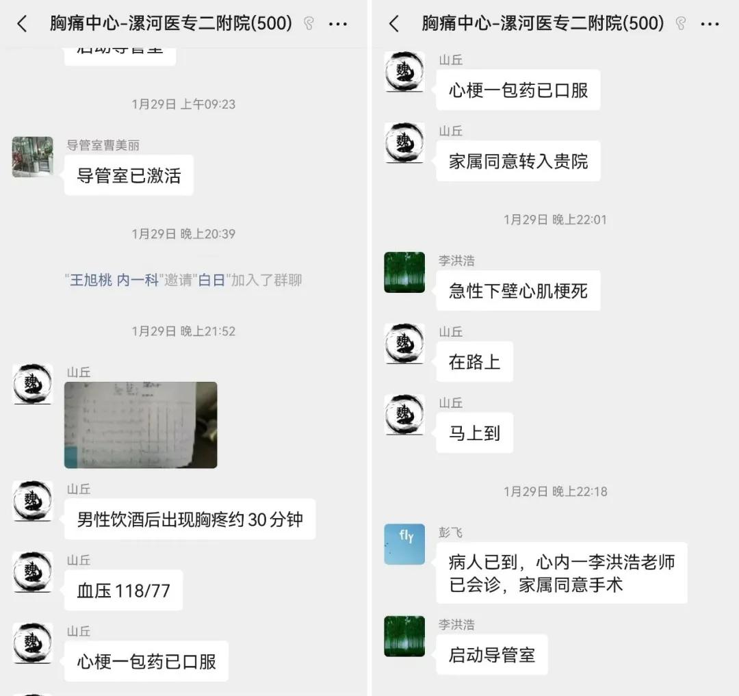 1月29日,正值大年初一,當晚9點52分,漯河醫(yī)專二附院胸痛中心工作群內接到信息,“一位男性患者飲酒后出現(xiàn)胸疼約30分鐘”。