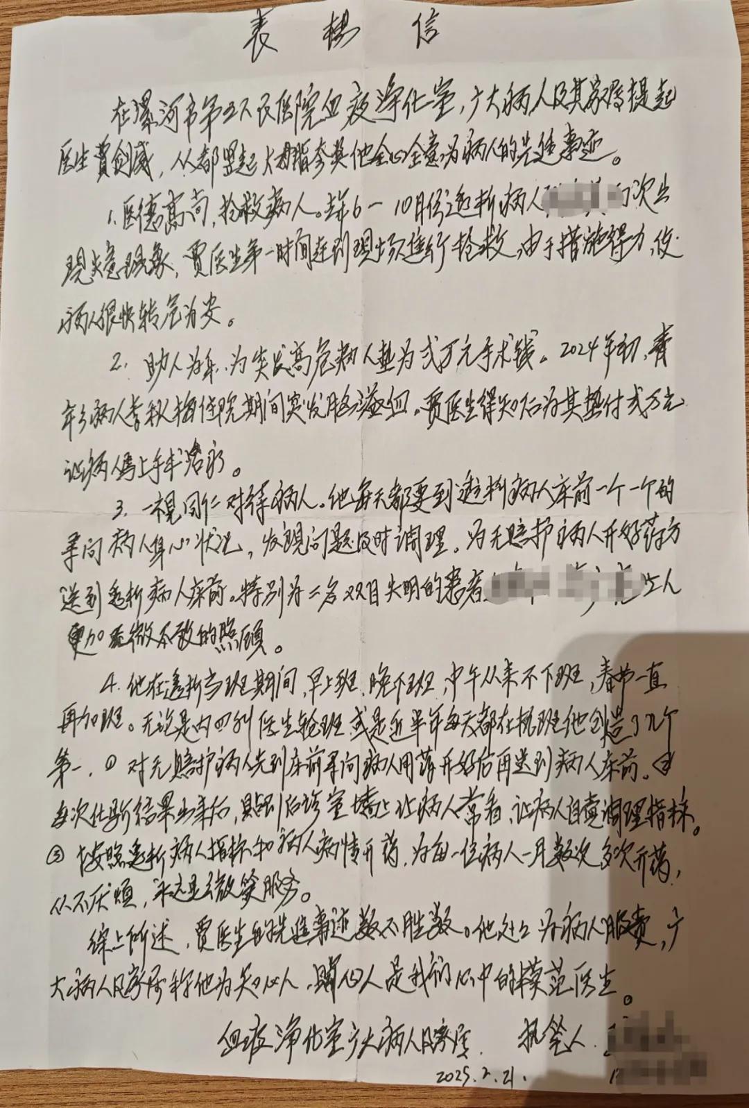 “他處處為病人服務(wù),廣大病人及家屬稱他為知心人、貼心人,是我們心中的模范醫(yī)生......”信箋上,溫暖的字句自然流淌,言語間都是對賈劍威醫(yī)生的信任與感激。