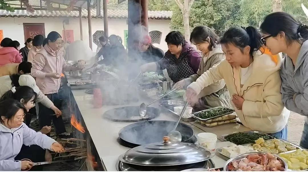 傍晚時(shí)分,炊煙裊裊。女職工們圍爐執(zhí)鏟,分組協(xié)作烹制自助地鍋,分工堪比手術(shù)室配合:有人專業(yè)控火如醫(yī)囑級“文火轉(zhuǎn)中火”,有人顛勺翻炒展現(xiàn)“無菌操作”式利落。柴火灶前翻炒聲、歡笑聲交織成趣。此刻,沒有無影燈與監(jiān)護(hù)儀,只有星辰煙火映笑顏。