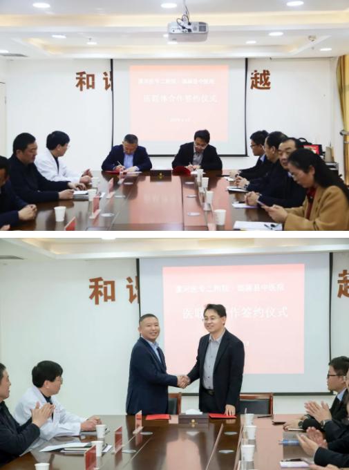 漯河醫(yī)專二附院黨委書(shū)記柴運(yùn)洪與臨潁縣中醫(yī)院黨委書(shū)記田學(xué)民分別代表雙方簽訂合作協(xié)議。