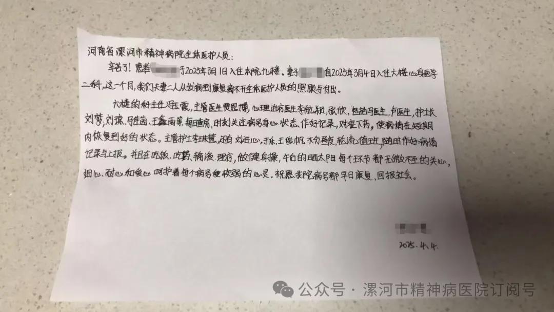 漯河市精神病醫(yī)院:一封感謝信——愛與責(zé)任的回響