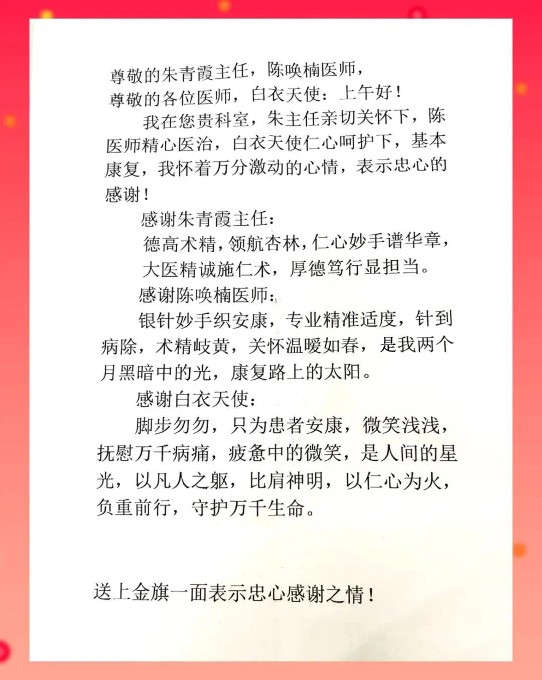 近日,市二院中醫(yī)針灸科門(mén)診醫(yī)護(hù)人員一如既往地忙碌著。突然,走廊里傳來(lái)一陣熱烈的掌聲,原來(lái),74歲的田大叔在家人陪伴下,手捧錦旗和感謝信來(lái)到醫(yī)院。田大叔激動(dòng)地展開(kāi)感謝信,聲情并茂地朗讀起來(lái),說(shuō)到動(dòng)情處更是眼含熱淚,字里行間飽含著對(duì)中醫(yī)針灸科主任朱青霞的誠(chéng)摯謝意和對(duì)整個(gè)醫(yī)護(hù)團(tuán)隊(duì)精湛醫(yī)術(shù)與暖心服務(wù)的認(rèn)可與贊美。讀完,田大叔深深地鞠躬致謝,這一躬身,更是見(jiàn)證中醫(yī)針灸科‘破冰’三十年病痛,醫(yī)患同心最好的詮釋。