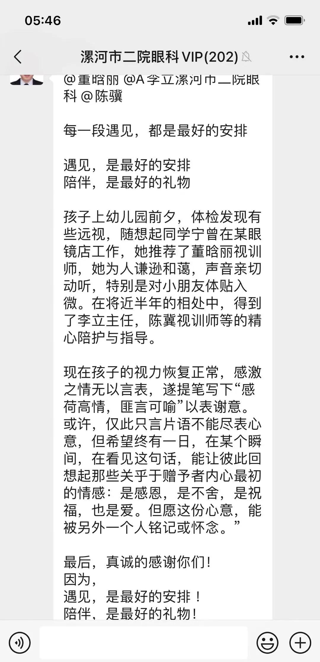 經(jīng)過半年多的康復(fù)訓(xùn)練,祺寶雙眼視力均提升到了該年齡段的正常水平0.5。祺寶的爸爸非常激動,為了表達(dá)對市二院眼科視覺康復(fù)中心全體醫(yī)護(hù)人員的感激之情,他親手創(chuàng)作了兩幅字畫,并在微信群發(fā)送了感謝信,代表了家長對醫(yī)護(hù)人員的深深敬意,更見證了市二院眼科團(tuán)隊在視覺康復(fù)領(lǐng)域的專業(yè)與付出。