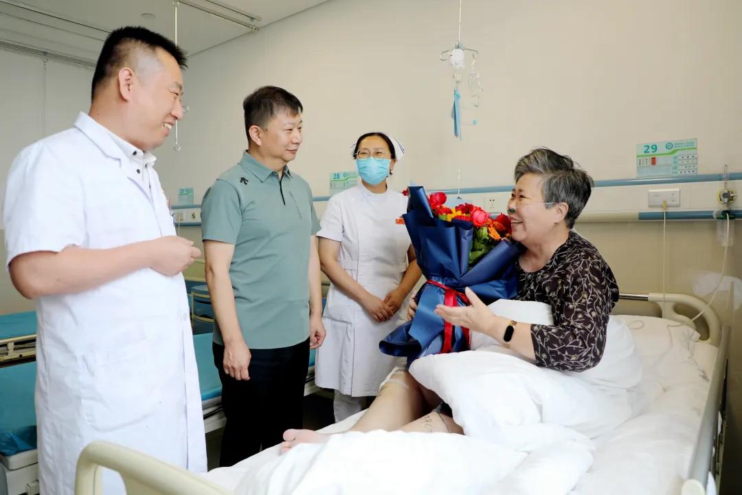 5月30日上午,市二院黨委書記魏松、副院長(zhǎng)劉橋?qū)3虂淼讲》浚赐繂栠@位康復(fù)中的香港同胞,送上代表健康祝愿的鮮花,關(guān)切詢問其身體恢復(fù)情況,并送上端午安康的祝福。“沒想到在異鄉(xiāng)生病,還能在節(jié)日收到這么溫暖的關(guān)懷,真的太感謝大家了!是二院優(yōu)秀的醫(yī)護(hù)團(tuán)隊(duì)救了我的命,我們?nèi)叶几屑げ槐M!感謝二院!感謝漯河!”翁阿姨激動(dòng)地表示,醫(yī)院高效的救治與貼心的服務(wù),讓他感受到了重生的喜悅和家一般的溫暖。
