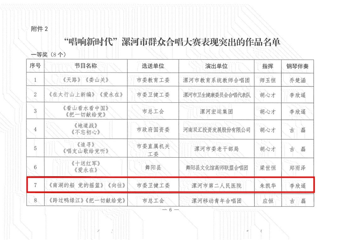 近日,漯河市文化廣電和旅游局下發(fā)《關(guān)于表彰“豫出彩 一起來”2024漯河市惠民文化活動(dòng)和“紅紅火火過大年”漯河市2025年民間藝術(shù)展演活動(dòng)表現(xiàn)突出的作品節(jié)目的通報(bào)》,市二院參賽曲目榮獲“唱響新時(shí)代”漯河市群眾合唱大賽一等獎(jiǎng)。