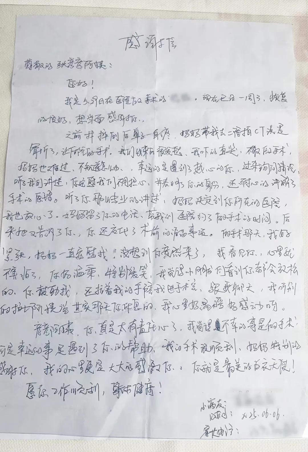 看似一個(gè)很平常的舉動(dòng),當(dāng)孩子?jì)寢尭嬷⒆右院?,小朋友在心底種下了感恩的種子,出院以后專程來(lái)醫(yī)院送來(lái)了這封感謝信......