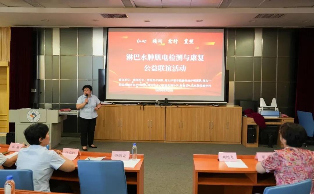 為了幫助乳腺疾病術(shù)后及術(shù)后出現(xiàn)淋巴水腫患者提高防治意識,漯河醫(yī)專二附院淋巴水腫MDT團(tuán)隊(duì),由護(hù)理部趙春紅主任倡導(dǎo),傷口造口治療室負(fù)責(zé)人成瀚牽頭,康復(fù)科負(fù)責(zé)人張靜及護(hù)士長田智慧,康復(fù)科肌電圖室張朝紅主任團(tuán)隊(duì),急診外科張曉光主任淋巴水腫手術(shù)團(tuán)隊(duì),外一科陳原主任及外三科護(hù)士長丁亞楠團(tuán)隊(duì),漯河醫(yī)專二附院取得國家級證書的所有人員共同參與本次活動。