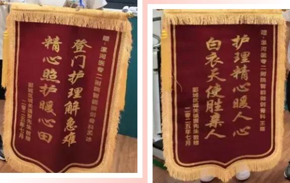 “真是太感謝孟冰和王露護(hù)士了,這兩面錦旗你們一定要收下!”7月16日,一名老年患者家屬將兩面錦旗送到了漯河醫(yī)專(zhuān)二附院(漯河市骨科醫(yī)院、漯河市立醫(yī)院)智能微創(chuàng)骨科護(hù)士站,再三感謝兩位護(hù)士上門(mén)為老人維護(hù)、更換導(dǎo)尿管。