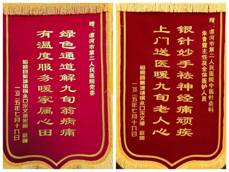7月20日上午,市二院門診大廳暖意融融,92歲宋老先生的家屬手捧兩面錦旗,專程向醫(yī)院黨委和中醫(yī)針灸科表達(dá)最誠(chéng)摯的謝意。副院長(zhǎng)劉橋受院黨委委托與全國(guó)先進(jìn)工作者、全國(guó)“五一”勞動(dòng)獎(jiǎng)?wù)芦@得者、中醫(yī)針灸科主任朱青霞及科室團(tuán)隊(duì)熱情接待了家屬,并鄭重接過了這份沉甸甸的心意。