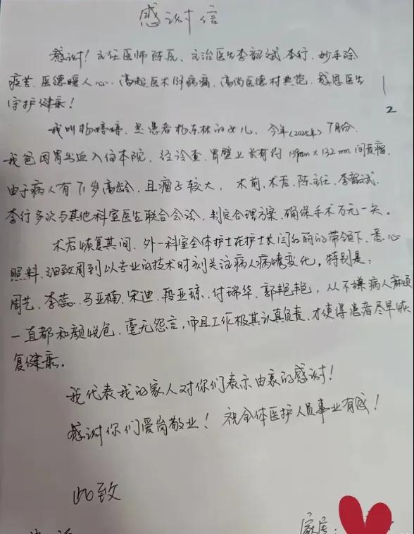 這封感謝信,是對普通外科全體醫(yī)護(hù)人員,尤其是對護(hù)理團(tuán)隊辛勤付出和專業(yè)精神的高度認(rèn)可與鼓勵。對團(tuán)隊而言,患者的康復(fù)和家屬的滿意是他們最大的追求。普通外科團(tuán)隊將繼續(xù)秉承“以患者為中心”的服務(wù)理念,不斷精進(jìn)醫(yī)療技術(shù),提升護(hù)理服務(wù)質(zhì)量,尤其是加強(qiáng)復(fù)雜、高齡患者圍手術(shù)期的精細(xì)化、人性化護(hù)理管理,用精湛的醫(yī)術(shù)祛除病痛,用溫暖的仁心守護(hù)健康,為更多患者帶來康復(fù)的希望和家的溫暖。(盧 闖 閆紅麗 劉 旭 袁錦鈺)