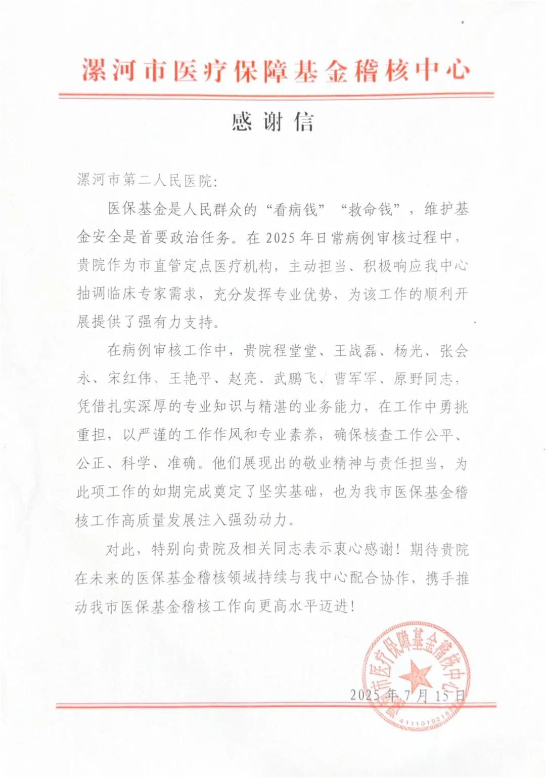 近日,市醫(yī)療保障基金稽核中心向市二院發(fā)來(lái)感謝信,對(duì)醫(yī)院選派多名業(yè)務(wù)骨干協(xié)助開(kāi)展2025年日常病例審核工作表示感謝,信中高度評(píng)價(jià)市二院專(zhuān)家團(tuán)隊(duì)以扎實(shí)的臨床功底和嚴(yán)謹(jǐn)?shù)墓ぷ髯黠L(fēng),高效完成病例合規(guī)性審查,為醫(yī)保基金監(jiān)管提供重要技術(shù)支持,并對(duì)醫(yī)院長(zhǎng)期以來(lái)在醫(yī)保政策落實(shí)、醫(yī)療質(zhì)量管控方面的工作成效給予充分肯定。
