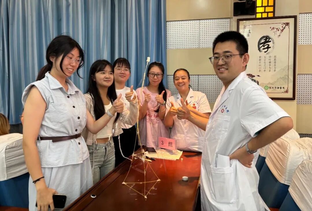 “團結協(xié)作”互動游戲:以14根意大利面、一個棉花糖、一卷膠帶為道具,將道具組合到一起做成一個模型固定到桌子上,哪個團隊的模型最高最結實,哪個團隊獲勝。游戲過程中,大家相互配合、彼此鼓勁,從生疏到默契,從緊張到從容,在歡聲笑語中打破了陌生壁壘。楊軼不時為大家加油,告誡大家不能靠個人的英雄主義和單打獨斗,通力合作才能出結果,團結才能共贏?,F場“醫(yī)院大家庭”的溫馨氛圍愈發(fā)濃厚。直至中午12點多,大家還意猶未盡。