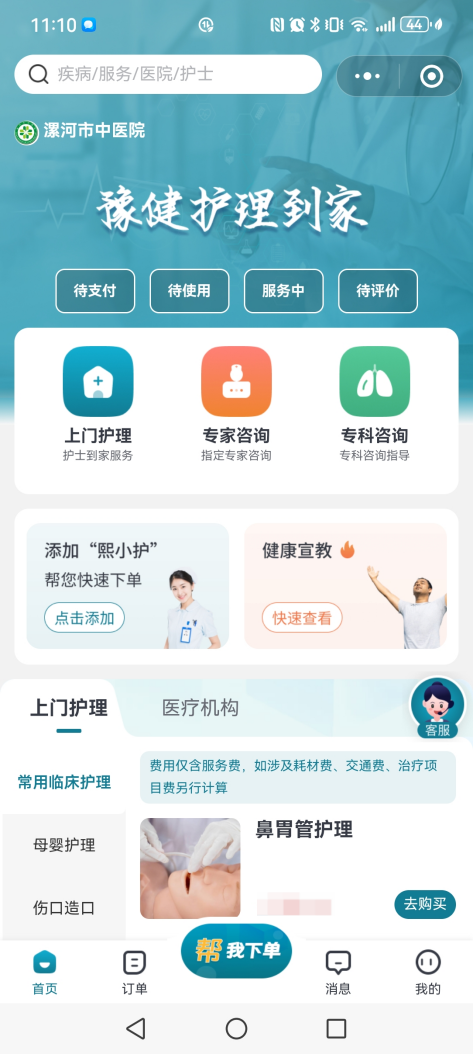目前,漯河市中醫(yī)院居家護(hù)理上線項目包含鼻胃管護(hù)理、導(dǎo)尿管護(hù)理、肌肉注射、皮下注射等常用臨床護(hù)理,新生兒測黃疸、新生兒臀部護(hù)理、產(chǎn)后會陰傷口護(hù)理、產(chǎn)后乳房護(hù)理等母嬰護(hù)理,特殊造口護(hù)理、疑難造口護(hù)理、失禁性皮炎護(hù)理等傷口造口護(hù)理,PICC護(hù)理、輸液港護(hù)理,灸法、中藥涂藥、刮痧、耳穴貼壓等中醫(yī)護(hù)理共7大類51項。居民通過手機(jī)端足不出戶即可在線預(yù)約居家護(hù)理服務(wù),執(zhí)業(yè)護(hù)士“一鍵接單”,提供專業(yè)的上門居家護(hù)理服務(wù),免去人民群眾奔波醫(yī)院之苦,讓優(yōu)質(zhì)護(hù)理服務(wù)觸手可及。