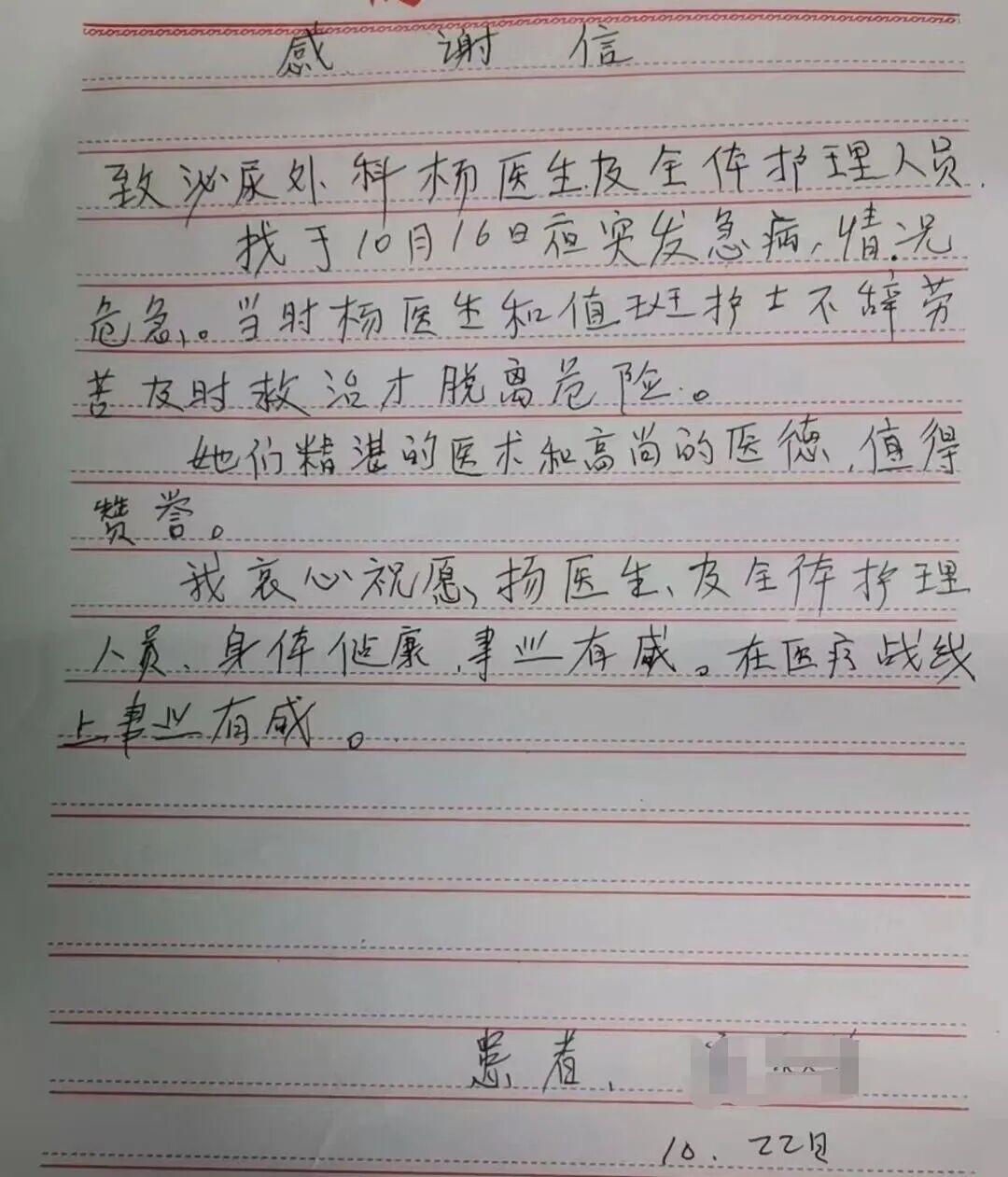 為感謝楊艷霞醫(yī)生的及時(shí)救治和護(hù)士們的貼心照顧,出院后患者特意寫下一封感謝信,字里行間滿是對(duì)楊醫(yī)生專業(yè)醫(yī)術(shù)、敬業(yè)精神和人文關(guān)懷的由衷贊譽(yù),也表達(dá)了對(duì)醫(yī)院泌尿外科醫(yī)療服務(wù)的高度認(rèn)可。