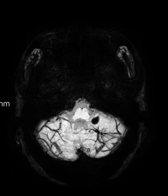 臨床中遇到一位患者,中年女性,反復(fù)出現(xiàn)頭痛,時(shí)輕時(shí)重,常規(guī)CT及磁共振檢查無明顯異常發(fā)現(xiàn),最后建議加做一個(gè)磁共振磁敏感加權(quán)成像(SWI),結(jié)果發(fā)現(xiàn)是左側(cè)小腦發(fā)育性靜脈畸形(DVA),SWI清晰顯示畸形的靜脈及周圍含鐵血黃素沉積;如下圖。這正是她頭痛的原因。