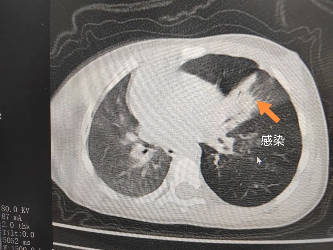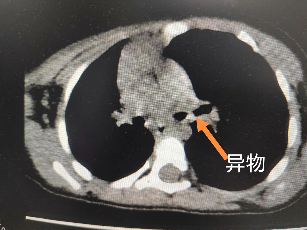 三天后(11月13日),趙寶出現(xiàn)高熱、咳喘加重,家長(zhǎng)著急了,再次帶他來(lái)到醫(yī)院。CT檢查顯示左肺過(guò)度充氣,左肺上下葉支氣管主干見(jiàn)不規(guī)則高密度影,左肺上葉可見(jiàn)大片狀密度增高影,縱隔窗實(shí)變,提示為“左側(cè)支氣管內(nèi)異物并繼發(fā)性改變,左肺上葉舌段肺膨脹不全”。