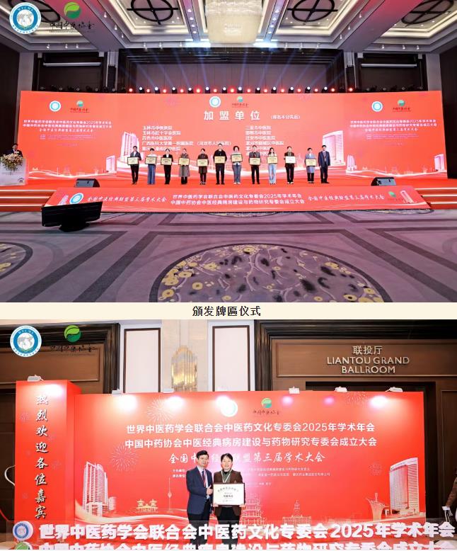 2025 年11月20-23日,世界中醫(yī)藥學(xué)會聯(lián)合會中醫(yī)藥文化專委會2025年學(xué)術(shù)年會、中國中藥協(xié)會中醫(yī)經(jīng)典病房建設(shè)與藥物研究專會成立大會暨全國中醫(yī)經(jīng)典聯(lián)盟第三屆學(xué)術(shù)大會在武漢隆重舉辦。