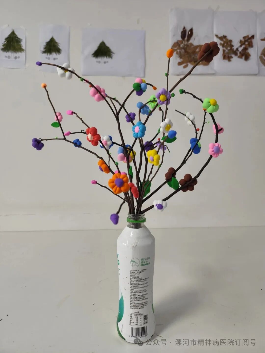 12月1日,漯河市精神病醫(yī)院心身醫(yī)學(xué)科的活動(dòng)室,有點(diǎn)不一樣,沒(méi)有復(fù)雜的工具,只有幾包彩色粘土、撿來(lái)的枯樹(shù)枝,還有一群帶著期待的患者。醫(yī)護(hù)人員要做的,是把“春天”捏進(jìn)枯枝里,裝在喝完的飲料瓶里~