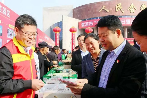 郭紅福(左)在漯河市消費(fèi)扶貧活動(dòng)啟動(dòng)儀式上為貧困戶產(chǎn)品代言
