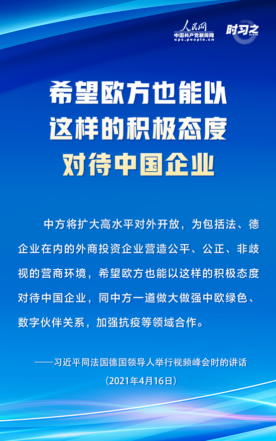 4月16日下午,國家主席習近平在北京同法國總統(tǒng)馬克龍、德國總理默克爾舉行中法德領導人視頻峰會。三國領導人就合作應對氣候變化、中歐關系、抗疫合作以及重大國際和地區(qū)問題深入交換意見。人民網(wǎng)·中國共產(chǎn)黨新聞網(wǎng)“時習之”欄目摘錄了習近平在這次視頻峰會上的重要講話內(nèi)容,一起學習。